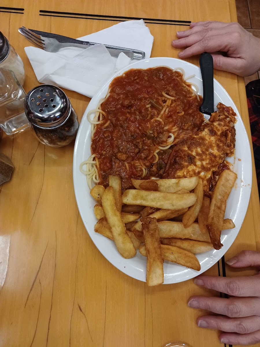 Tasty food and got a free meat sauce when we ordered a Lotta food. It was good quality and we were full. Worth the price. Good service e and I'd recommend for people who are stopping by and looking for a place to eat real fast and it's good, good quality overall was happy and keep on traveling , I sugges tt you stop by !